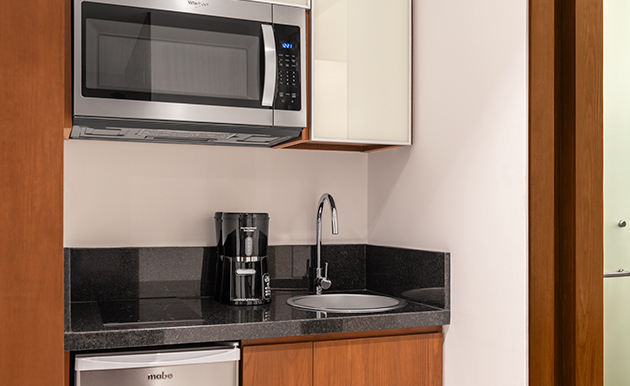 Este lujoso loft cuenta con una recámara, una cocina pequeña, una sala de estar, un baño y balcón.
