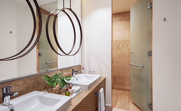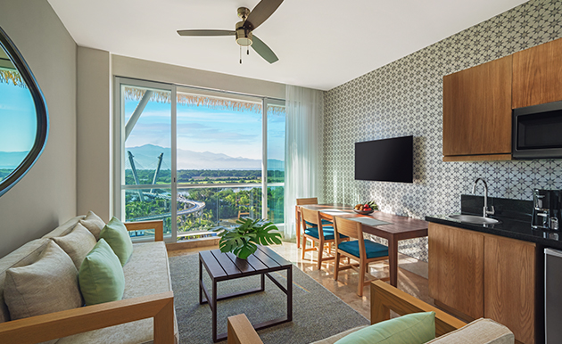 Esta lujosa suite cuenta con una recámara, una cocina pequeña, una sala de estar, un comedor para 4 personas, un baño y un balcón.