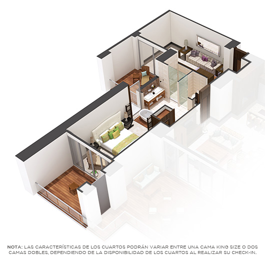 La Villa Junior cuenta con una recámara con una cama king-size, baño con jacuzzi, sala de estar con sofá cama, terraza privada y dos TVs.