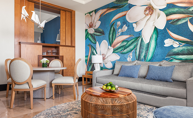 Esta suite cuenta con una cama king-size, dos baños, dos televisiones, una sala de estar con sofá cama, un comedor para cuatro personas y una cocina pequeña con electrodomésticos.