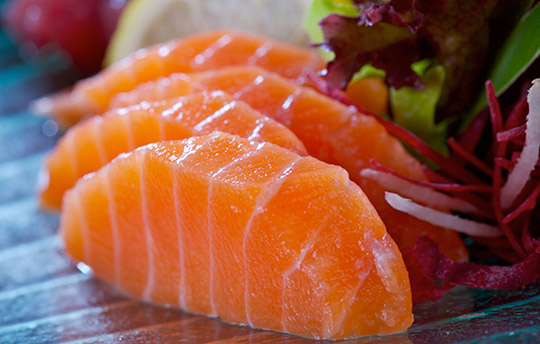 Este tibio sashimi de salmón está acompañado de jengibre y ajo, sazonado con aceite de oliva y salsa de soya cítrica.