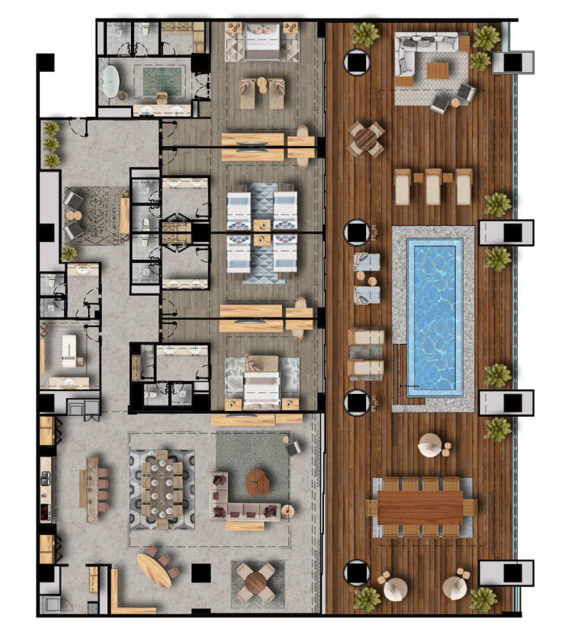 This awe-inspiring sanctuary redefines sophistication with a single-level design that blends indoor and outdoor living. Featuring a gourmet kitchen, a dining area for twelve, and a stylish lounge, this residence offers two master suites with king beds and spa-inspired baths, plus two additional bedrooms with twin beds and en-suite baths. Its crown jewel is the expansive terrace with private pool, multiple lounge spaces, and an elegant massage cabin, all crafted for unforgettable gatherings and ultimate tranquility.