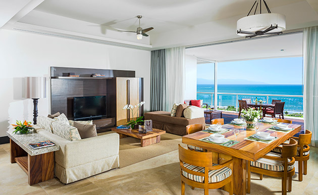 This beautiful living space features two bedrooms with two king-size beds, two and a half bathrooms with two Jacuzzi tubs, a terrace with a plunge pool, a separate private deck, a gourmet kitchen, two living areas with sleeper sofas, and four TVs.