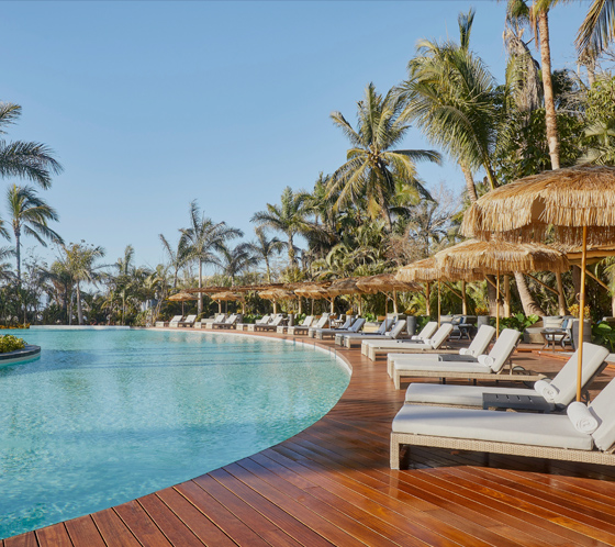 This distinctive pool boasts a famous spiral shape and expansive lounging area while offering sweeping views of the Ameca River and Bay of Banderas. Featuring a horseshoe-shaped cluster of Jacuzzis, a swim-up bar, and food service by Si Snack.