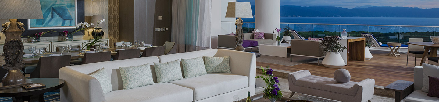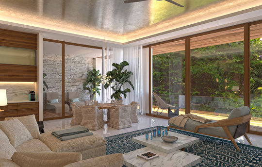 This luxurious space features a gourmet kitchen with dining space, three bedrooms, five bathrooms, a private terrace, and large private plunge pool.
