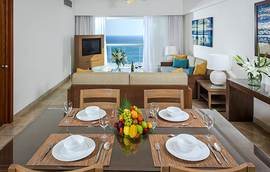 The space features two bedrooms, complete with two double beds and a king-size bed at Mayan Palace Golf, and your choice of two king-size beds or a king-size and two double beds at Mayan Palace Playa. It also features a kitchen, a living room, private balcony, and two bathrooms.