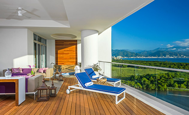 This expansive space spans an entire floor and is accessed directly by the elevator. It features a gourmet kitchen, breakfast bar, wine bar, dining table for 10 people, and living room with TV. It offers two terraces, one with a plunge pool and outdoor dining area. It features two bedrooms with king-size beds, and two bedrooms with double beds, as well as four and a half bathrooms and two Jacuzzi tubs. This unit also includes 5 TVs.