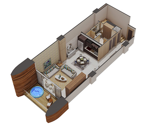This gorgeous two-story space features a first floor featuring a gourmet kitchen, dining table, living room, and full bathroom with shower. The second floor features a bedroom with king-size bed, and bathroom with a Jacuzzi tub. Off the first floor, there is a private terrace with a plunge pool and small private balcony at the back. This unit also includes 2 TVs.