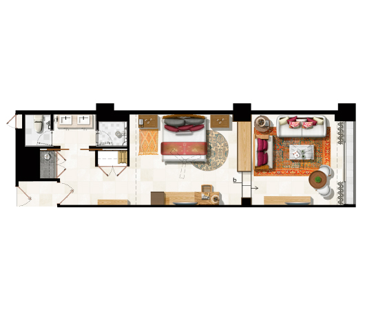 Este lujoso loft cuenta con una recámara, una cocina pequeña, una sala de estar, un baño y balcón.
