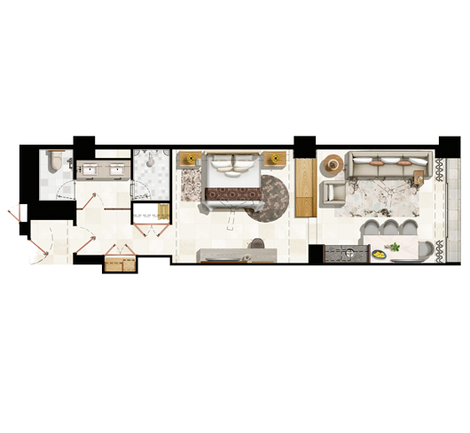 Esta lujosa suite cuenta con una recámara, una cocina pequeña, una sala de estar, un comedor para 4 personas, un baño y un balcón.