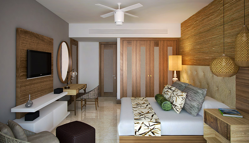 Designed by a team of experts from Grupo Vidanta, the Jungle Suites’ interiors complement the exuberant exterior to perfection. Their dark wood accents, organic design elements, neutral linens, and woven details harmonize the impressive nature outside with the comfort of the suites. Paintings and other decorative accessories incorporate elements associated with the jungle and its surroundings, like the vivid blues and greens of the Caribbean.