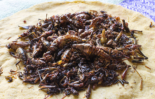 Traditional crispy grasshoppers with lime and chili powder, served with handmade corn tortillas and guacamole.
