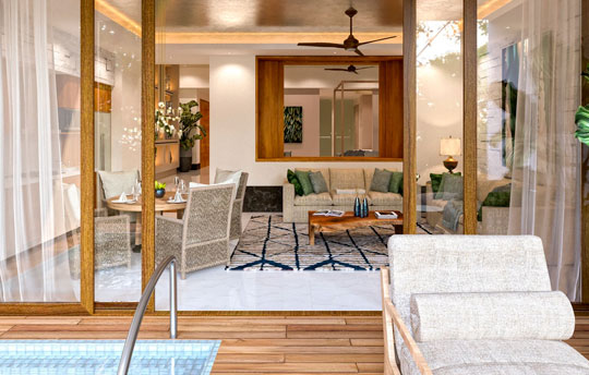 This luxurious space features a gourmet kitchen with dining space, three bedrooms, five bathrooms, a private terrace, and large private plunge pool.