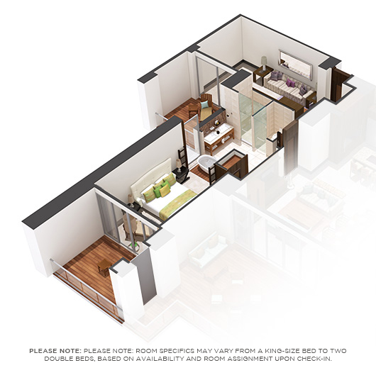 La Villa Junior cuenta con una recámara con una cama king-size, baño con jacuzzi, sala de estar con sofá cama, terraza privada y dos TVs.