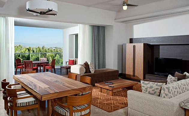 The One Bedroom Villa features one bedroom with a king-size bed, one and a half bathrooms with one Jacuzzi tub, a gourmet kitchen, a living room with a sleeper sofa, dining room, sprawling terrace with a plunge pool, and two TVs