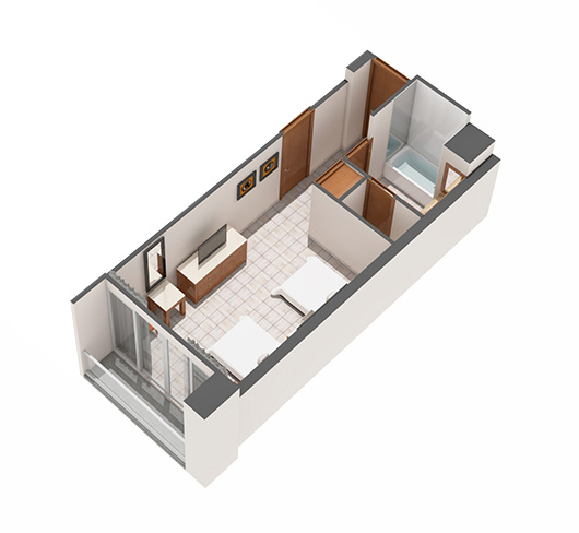 The Master Room features two double beds, one bathroom, one television, and balcony.