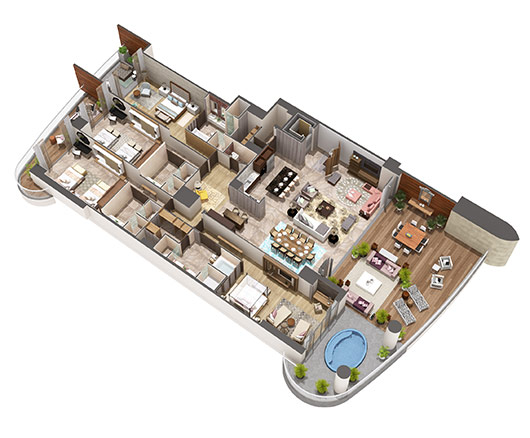 This expansive space features a gourmet kitchen with oven, breakfast bar, wine bar, dining table for 10 people, and living room with TV. It has two terraces, one with a plunge pool and outdoor dining area. It features two bedrooms with king-size beds, and two bedrooms with double beds, as well as four and a half bathrooms and two Jacuzzi tubs. This unit also includes 5 TVs.