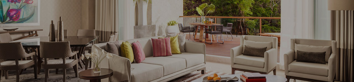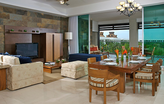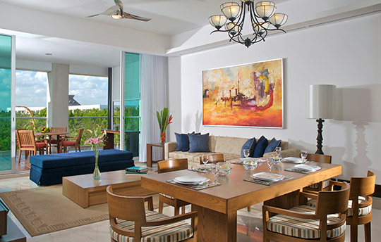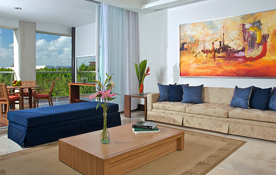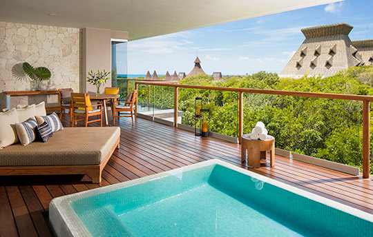 This space features a kitchen, a living room, private terrace with plunge pool, two bedrooms, and two and a half bathrooms with two Jacuzzi tubs.