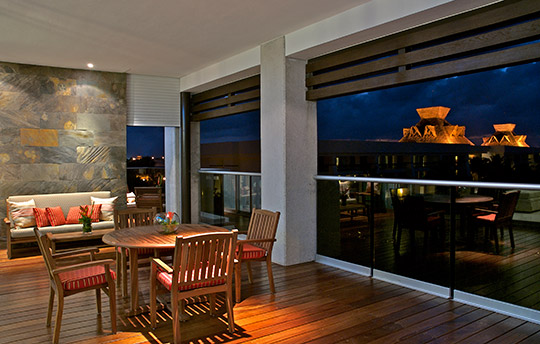 This gorgeous unit features a gourmet kitchen, living room, three bedrooms, three bathrooms with Jacuzzi spa tubs, a massage room, and sprawling private terrace with plunge pool.
