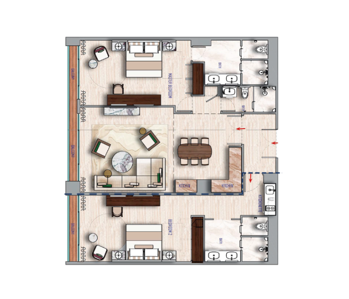 This spacious suite offers a well-designed split floor plan with two private bedrooms on either side of a kitchenette, dining area, and living room, plus a extra-long private outdoor balcony.